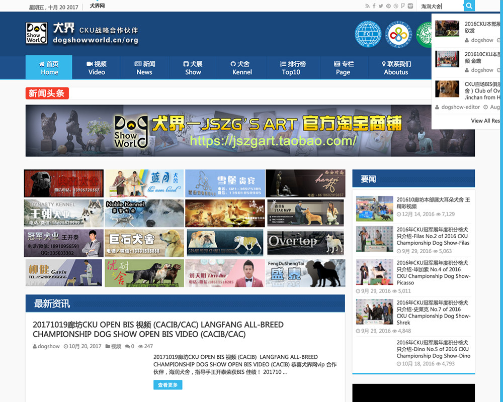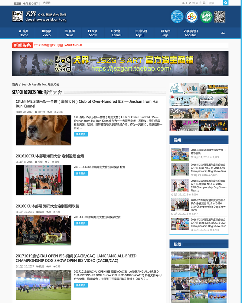 内含 视频,新闻,犬展,犬舍,排行榜,专栏 六大分栏目。