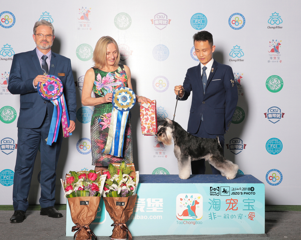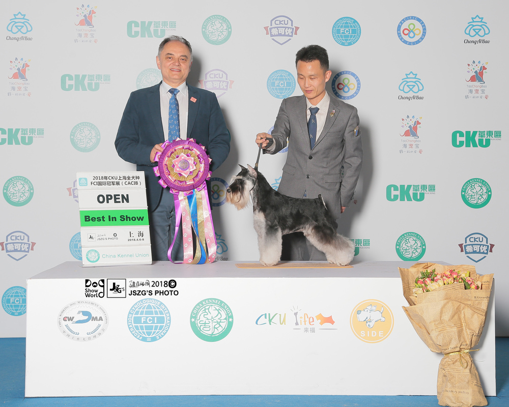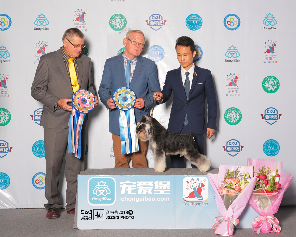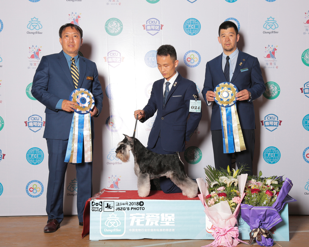 So far,Saga is the youngest one to obtain over 200 OPEN BIS in Chinese all breeds. He set a new record for China.Untill now,Saga is top1 in 2018 CKU all breeds and as well in the Chinese local dog rank.Also,he is ranking 1 in miniature schnauzer breed ,and also ranking 1 in Group 2 .