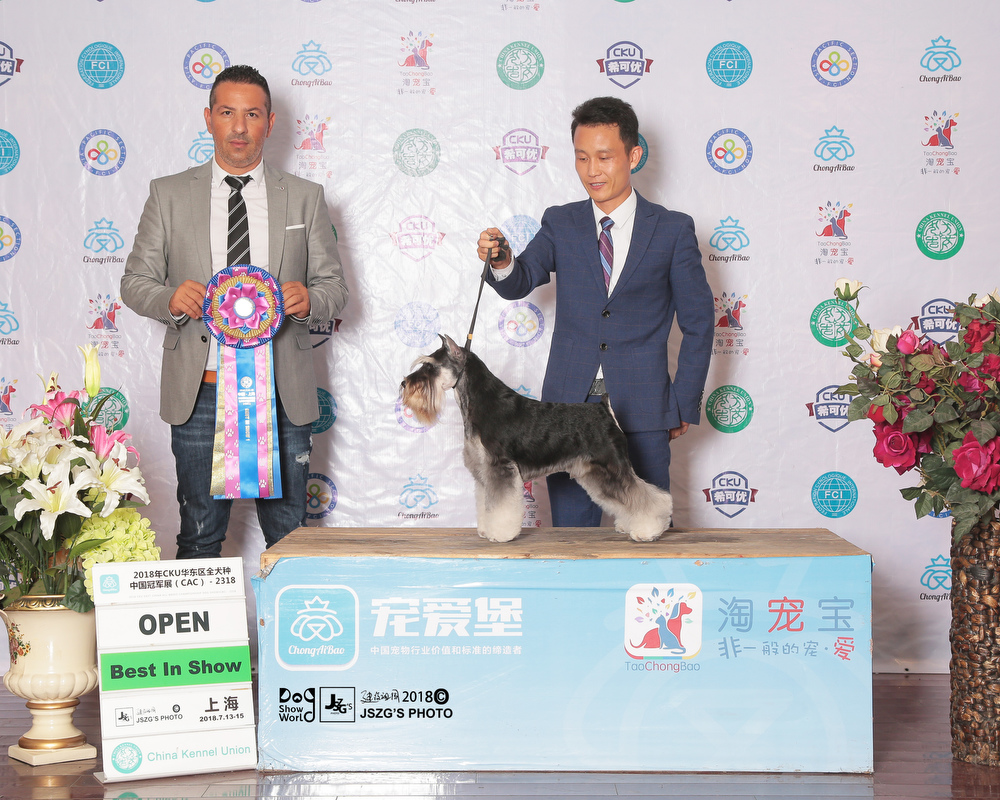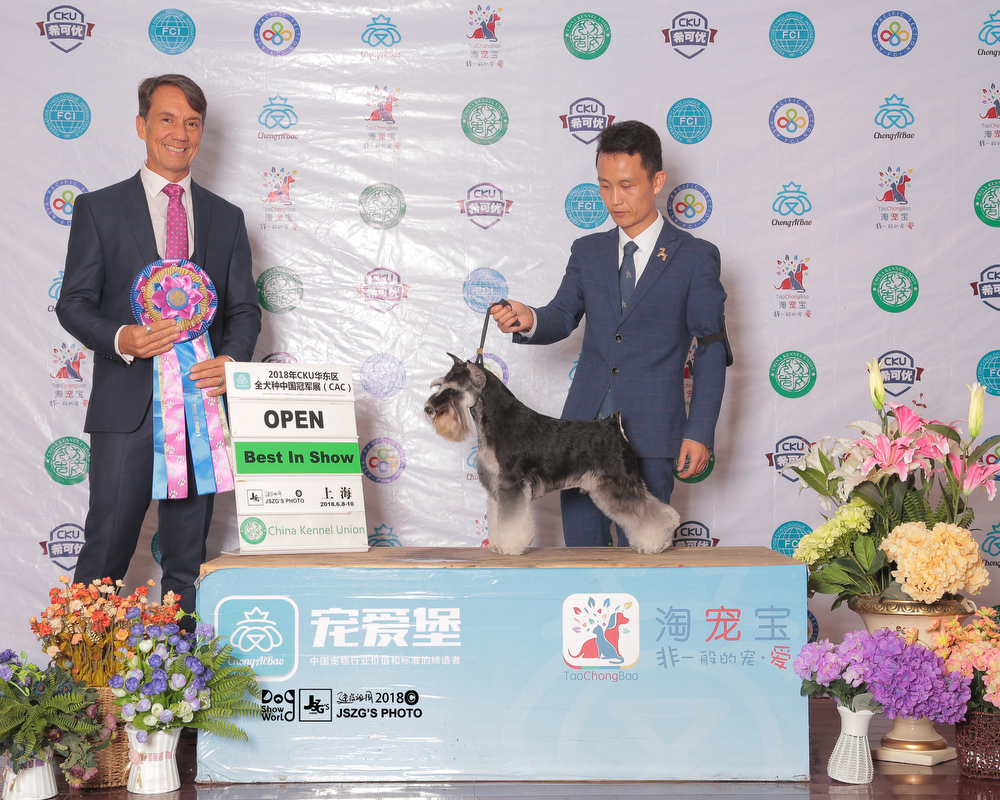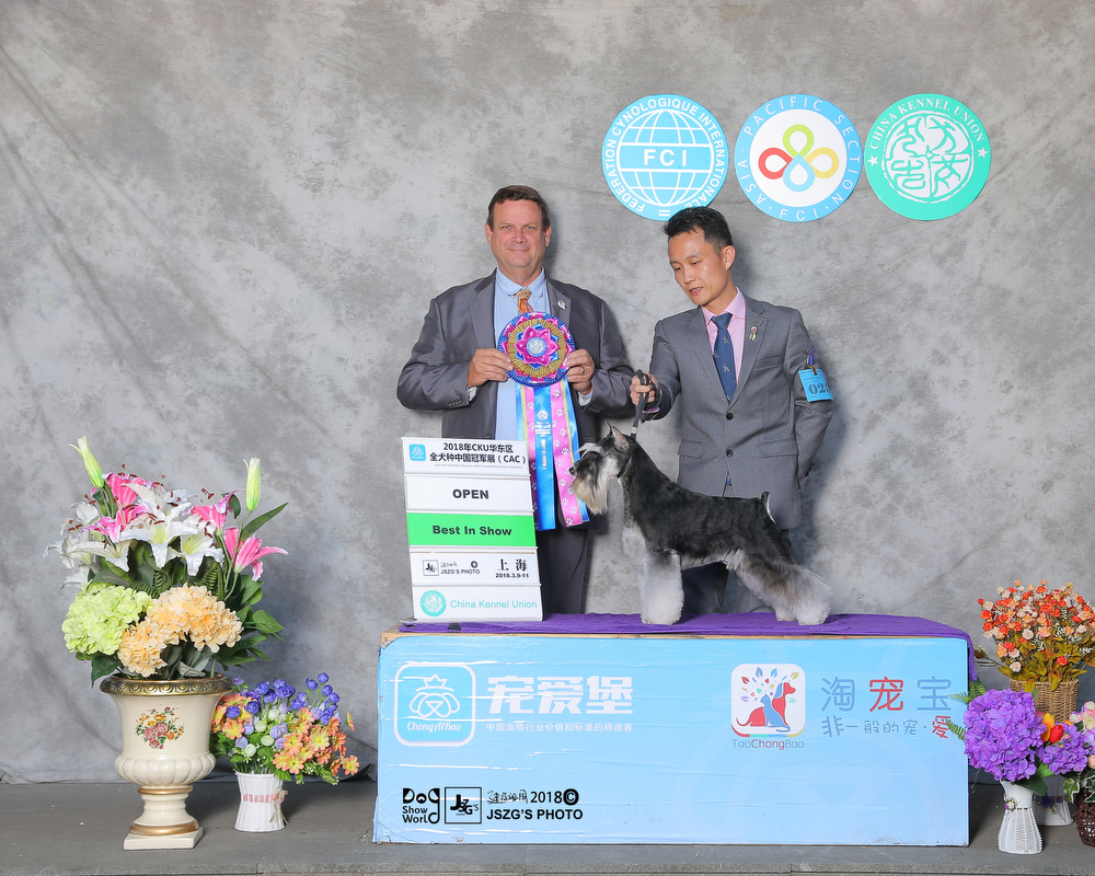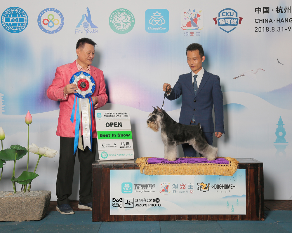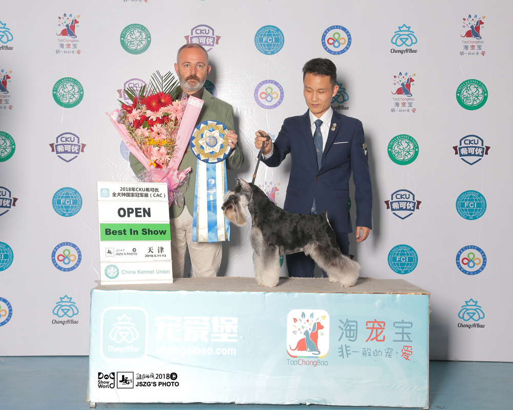 So far,Saga is the youngest one to obtain over 200 OPEN BIS in Chinese all breeds. He set a new record for China.Untill now,Saga is top1 in 2018 CKU all breeds and as well in the Chinese local dog rank.Also,he is ranking 1 in miniature schnauzer breed ,and also ranking 1 in Group 2 .