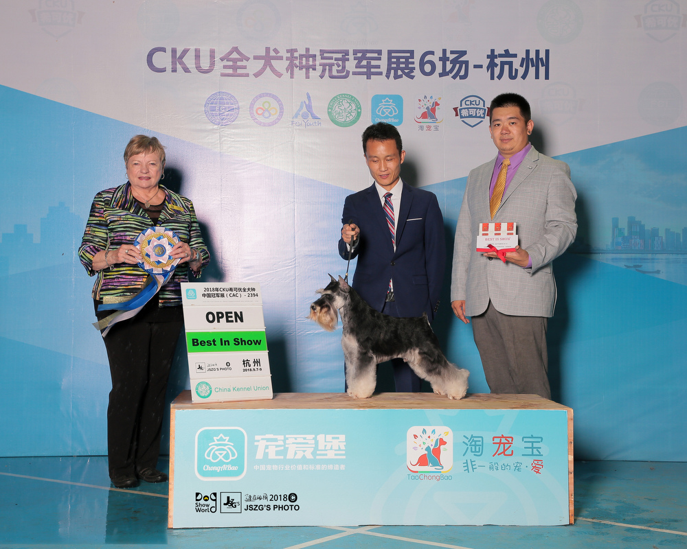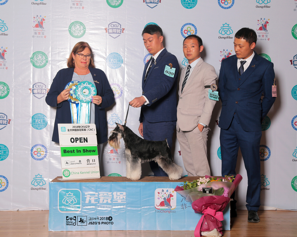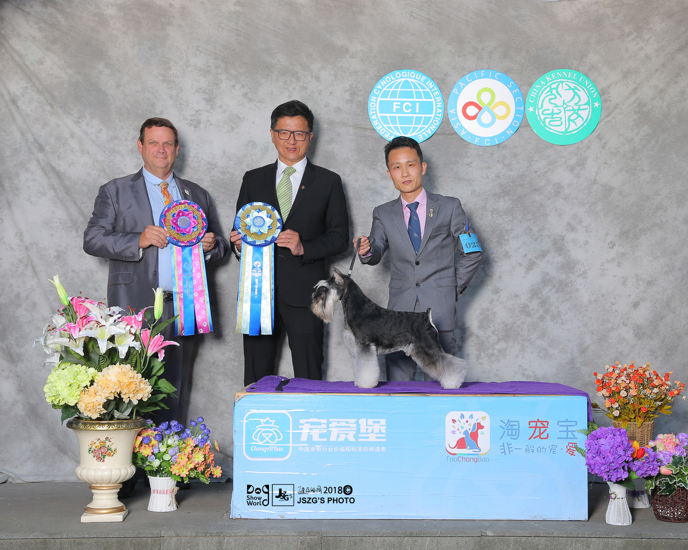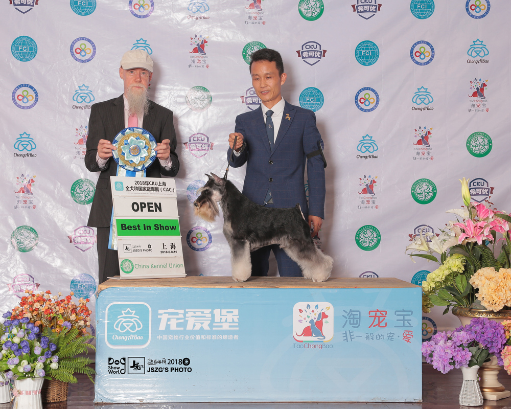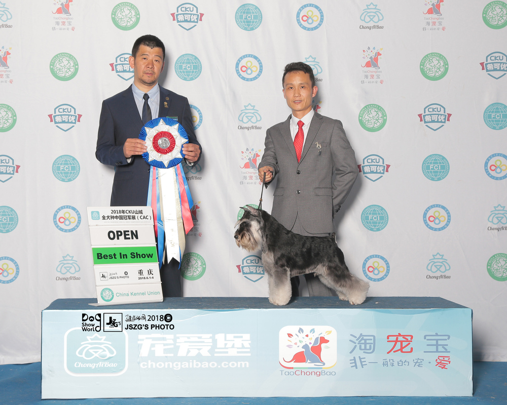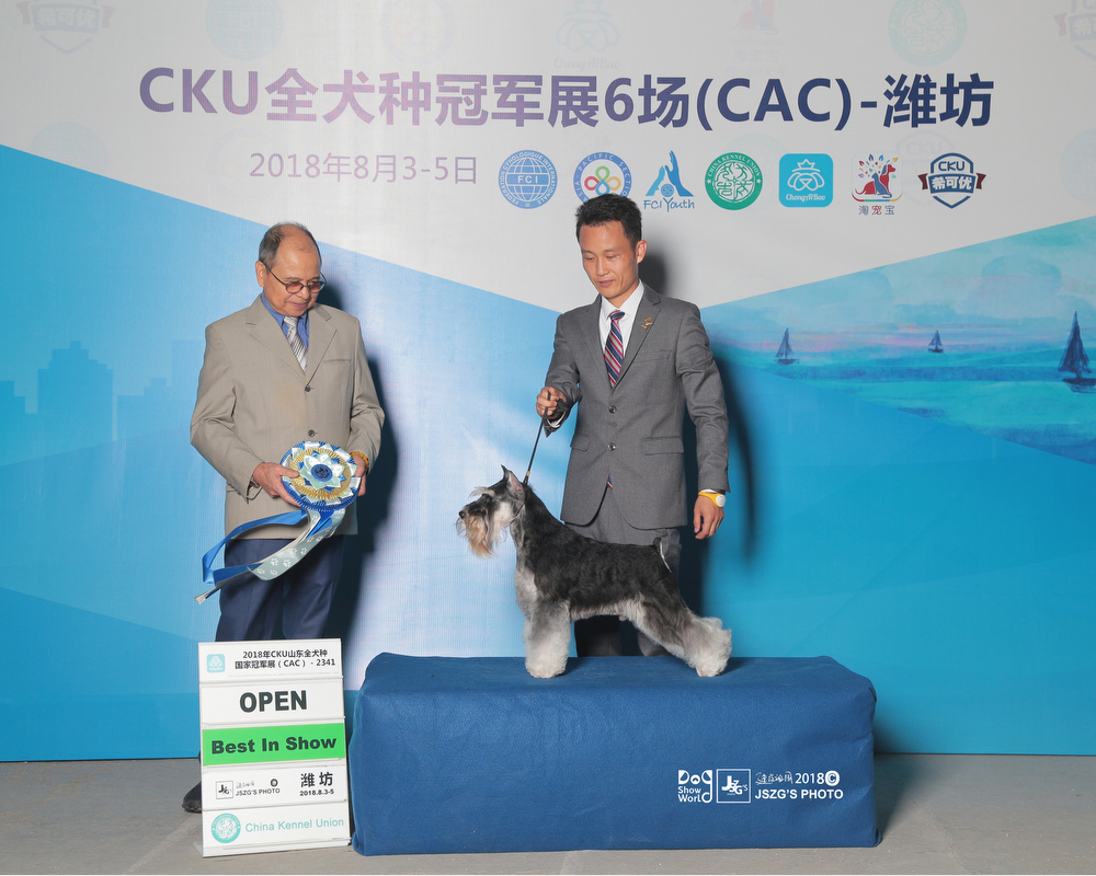 In September 2018,the CKU CHANGZHI championship dog show, there is an excellent dog who is the Chinese youngest one to obtain over 200 OPEN BIS .It is a miniature schnauzer(Black and Silver)named “Saga”that is from Xing Yue Kennel.