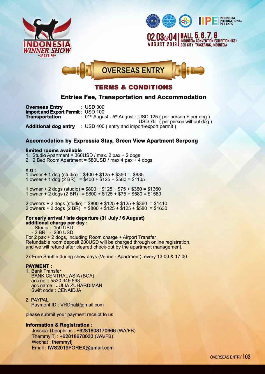 2019印度尼西亚优胜展将在2019年8月2~4日举行,尚未报名的犬主们需要抓紧时间了,截止日期为2019.07.12。印尼的爱宠人士是非常喜爱优秀犬的,只要是优秀的犬,他们从不吝啬为其买单,这也促使了印尼的宠物行业的迅速发展。