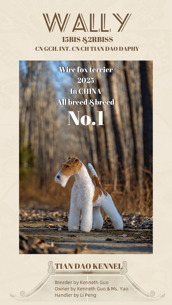 瓦利是天道犬舍自主繁殖的一只姜色猎狐梗,年仅17个月龄在2025年竞争激烈的梗犬组表现抢眼,获得单犬种排行一,梗犬组排行二。拿到了15个BIS级别成绩。单犬种积分112.是CKU有比赛记录以来第一只单犬种积分过百的刚毛猎狐梗。